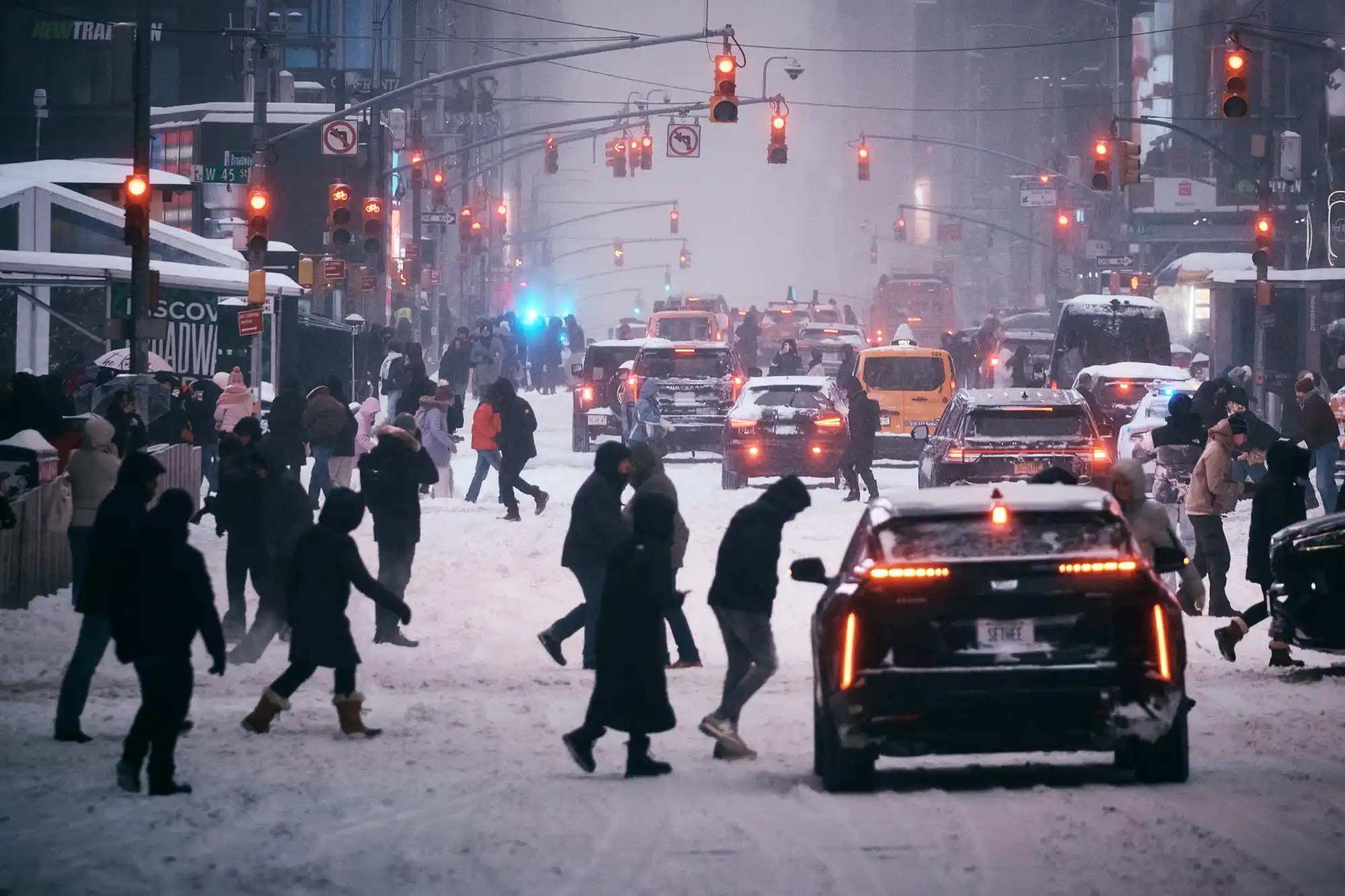 People cross the street as traffic moves along during a snowstorm on January 25, 2026 in New York City. Andres Kudacki/Getty