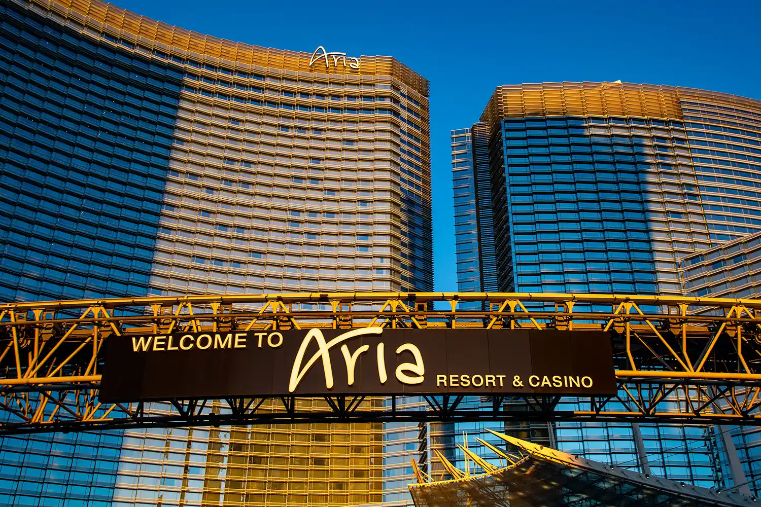 A photo of the Aria Resort & Casino sign in Las Vegas.