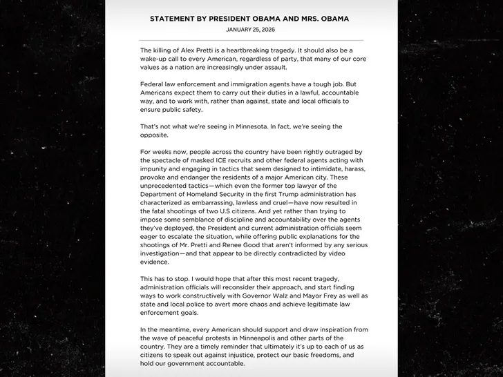 Barack and Michelle Obama released a strong-worded joint statement Sunday, breaking their silence on the killing of Alex Pretti, making one thing clear … “This has to stop.”