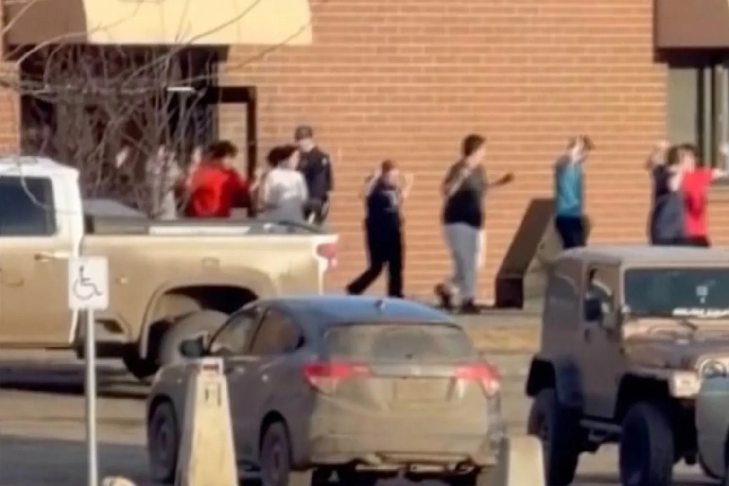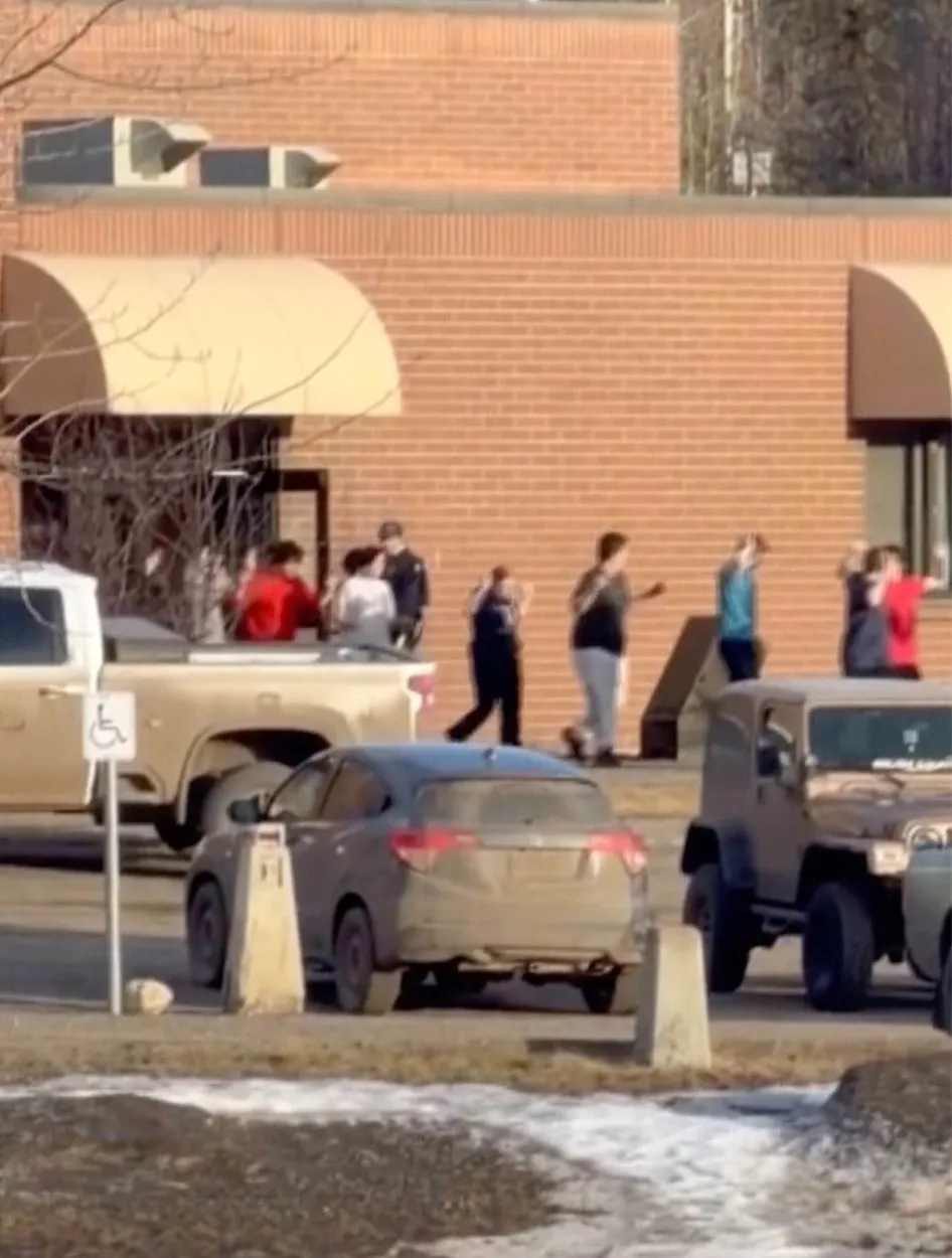 Students are seen exiting Tumbler Ridge Secondary School in British Columbia, Canada after the shooting on Feb. 10, 2026.