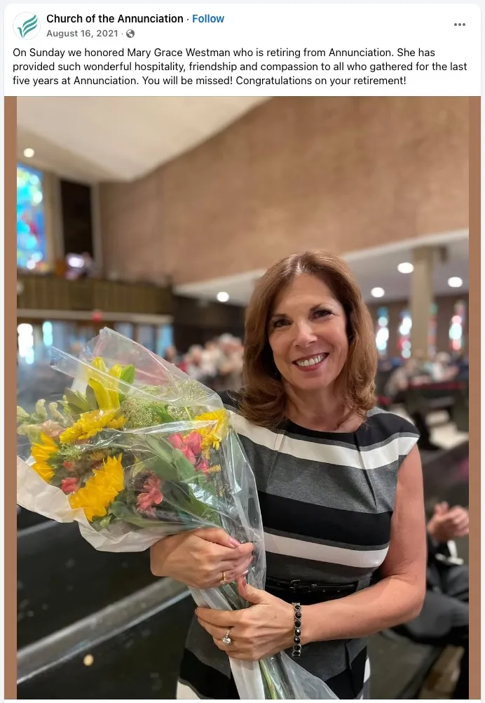 Mary Westman was identified as the mother of the gunman in the shooting at the Annunciation Church and Catholic School in Minneapolis, where she is an employee. Facebook / Mary Grace Westman