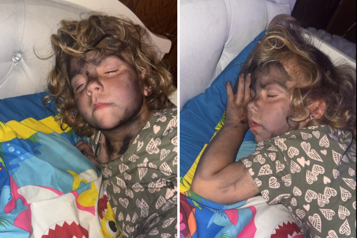Captured with the camera flash on, Ashtyn Noelle’s daughter was tucked up in bed with a very dark-streaked face. Her arms and chest also seemed to be covered with the dye.