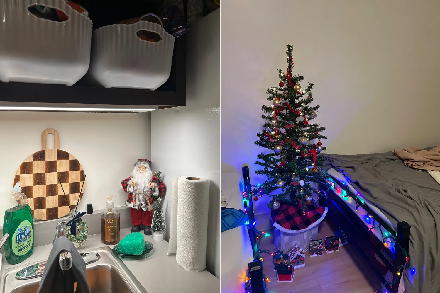 To bring warmth and cheer to their temporary home, she added festive decorations and “cozy” touches like a small tree, twinkling lights and Christmas figurines.