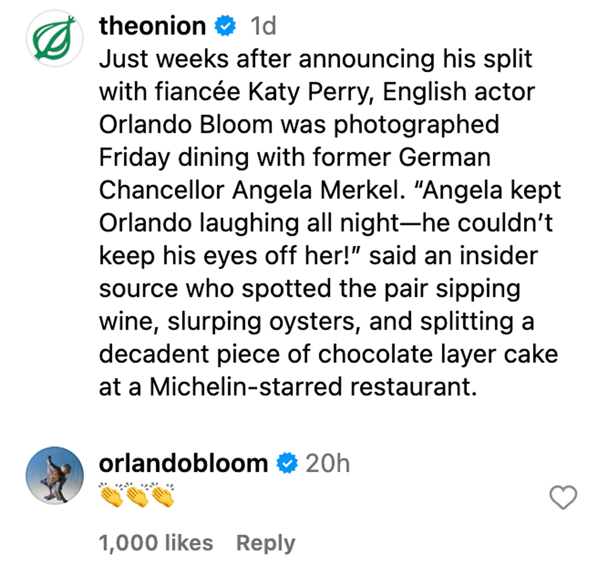 Rather than brushing off The Onion’s ribbing, Bloom actually applauded it, commenting “👏👏👏” on the post.