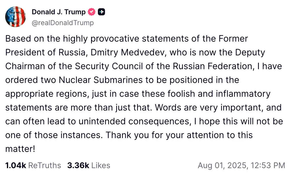 “I have ordered two Nuclear Submarines to be positioned in the appropriate regions, just in case these foolish and inflammatory statements are more than just that,” Trump wrote on Truth Social, without revealing the location of the vessels.